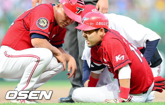 2일 오후 인천 문학구장에서 열린 '2012 팔도 프로야구' SK 와이번스와 KIA 타이거즈의 경기 7회초 1사 2,3루 이용규가 1타점 내야안타를 친 후 1루에서 다리 고통을 호소하고 있다.