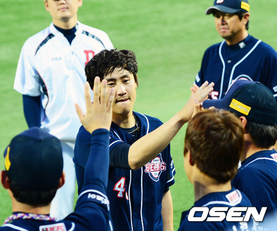 3일 오후 대구 시민구장에서 열린 '2012 팔도 프로야구' 삼성 라이온즈와 두산 베어스의 경기 8회를 마치고 두산선발 이용찬이 덕아웃으로 들어오며 동료들과 하이파이브를 하고 있다.