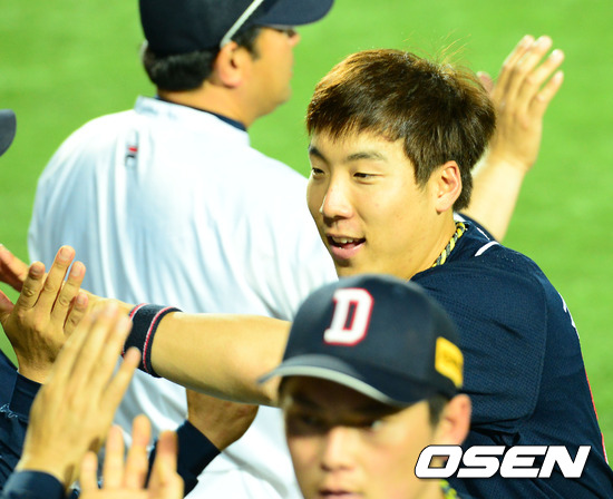 경기를 마치고 두산 김현수가 코치들과 하이파이브를 하고 있다. / rumi@osen.co.kr