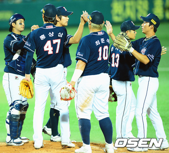 경기를 마치고 두산 선수들이 마운드 근처에 모여서 기쁨을 나누고 있다. / rumi@osen.co.kr