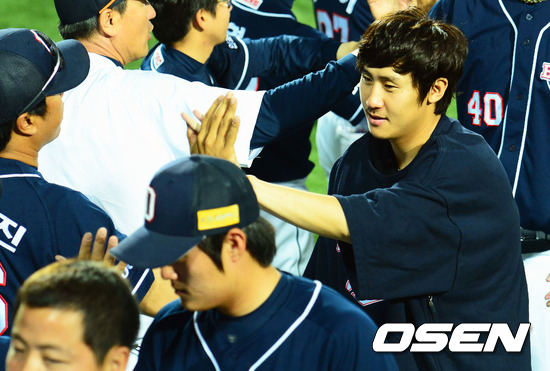 경기를 마치고 두산 이용찬이 코치들과 하이파이브를 하고 있다. / rumi@osen.co.kr