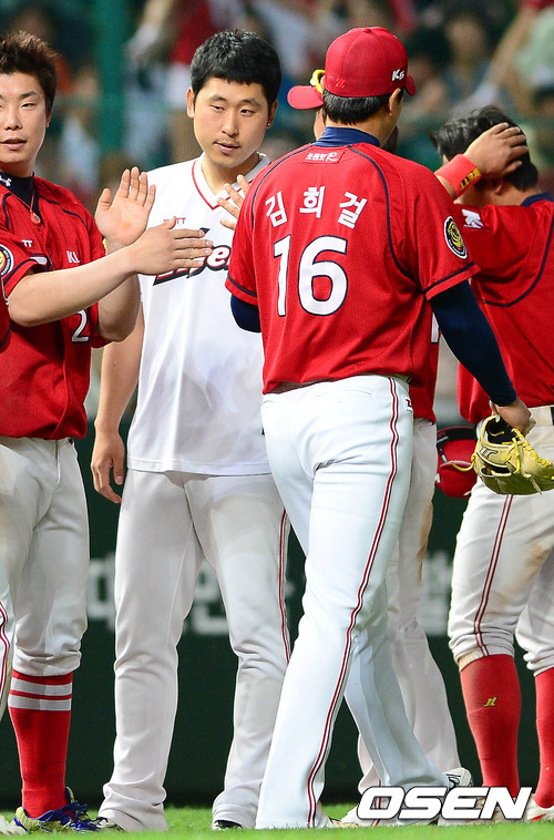 2일 오후 인천 문학구장에서 열린 '2012 팔도 프로야구' SK 와이번스와 KIA 타이거즈의 경기 종료후 윤석민과 김희걸이 하이파이브를 하고 있다.