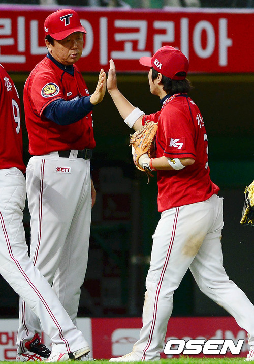 2일 오후 인천 문학구장에서 열린 '2012 팔도 프로야구' SK 와이번스와 KIA 타이거즈의 경기 종료후 선동렬 감독과 김선빈이 하이파이브를 하고 있다.