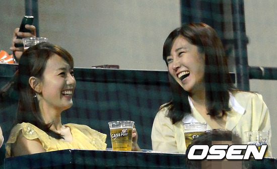 3일 오후 서울 잠실구장에서 열린 '2012 팔도 프로야구' LG 트윈스와 한화 이글스의 경기를 KBS 최희 아나운서(오른쪽)와 정지원 아나운서가 경기를 관람하고 있다.
