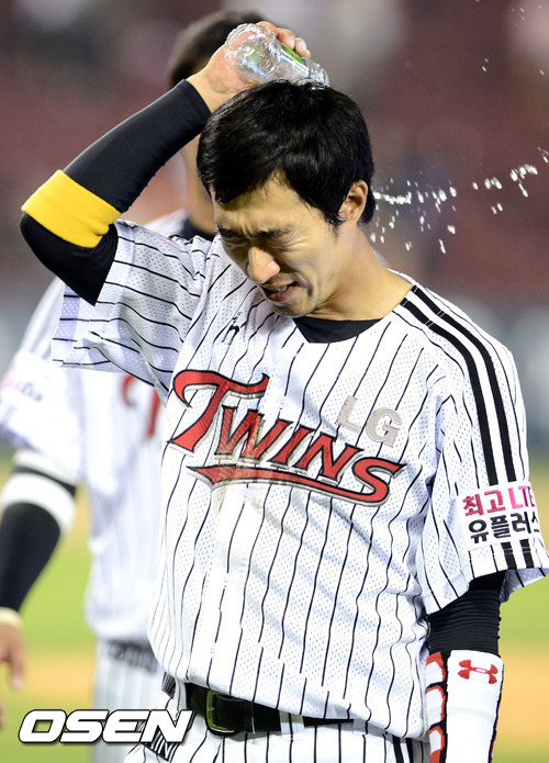경기 종료후 LG 정성훈이 무승부가 아쉬운듯 물을 자신의 머리에 뿌리고 있다. / youngrae@osen.co.kr