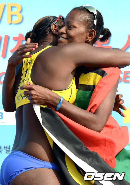 3일 서울 잠실 한강시민공원에서 열린 '2012 FIVB 세계여자비치발리볼 서울 챌린저 대회' 1위를 차지한 바누아투 팀이 포옹을 하고 있다.