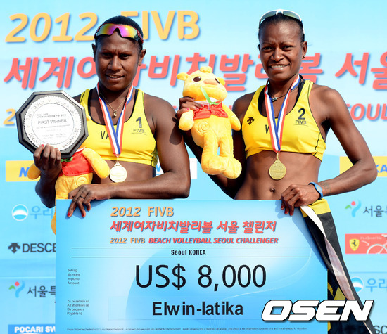 3일 서울 잠실 한강시민공원에서 열린 '2012 FIVB 세계여자비치발리볼 서울 챌린저 대회' 1위를 차지한 바누아트 팀이 포토타임을 갖고 있다.