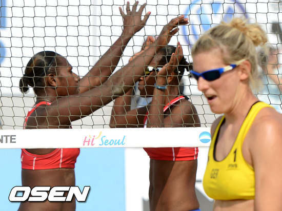 3일 서울 잠실 한강시민공원에서 열린 '2012 FIVB 세계여자비치발리볼 서울 챌린저 대회' 결승 밀러 엘윈-헨리에트 이에디카 바누아트 조가 득점에 성공하고 기뻐하고 있다.