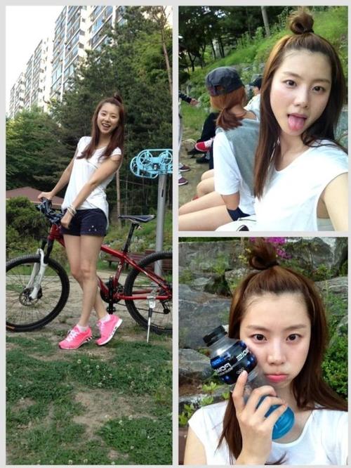 사진 속 박수진은 핫팬츠를 입고 운동화를 신은 채 완벽하게 사이클링 준비를 갖춘 모습이다. 앞머리를 모두 올려 묶은 뒤 자전거 옆에서 환하게 미소를 짓거나, 이온음료를 들고 지쳐보이는 표정을 짓고 있는 그의 모습은 사랑스러운 매력을 느끼게 한다.