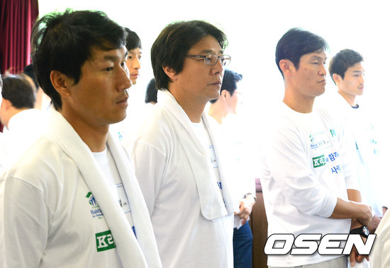 4일 오후 경기도 파주시 법원읍 법원리 해비타트 파주 현장에서 'K리그와 함께하는 사랑의 집 고치기' 봉사활동에서 대전 유상철 감독과 포항 황선호 감독, 서울 최용수 감독이 정몽규 총재의 인사말을 듣고 있다