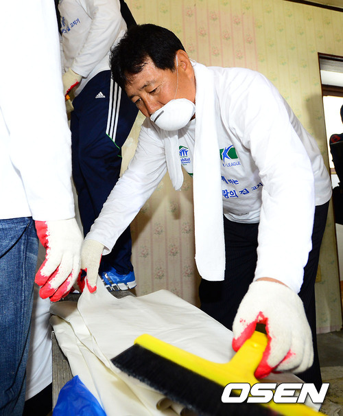 4일 오후 경기도 파주시 법원읍 법원리 해비타트 파주 현장에서 'K리그와 함께하는 사랑의 집 고치기' 봉사활동에서 광주 최만희 감독이 벽지에 풀칠을 하고 있다