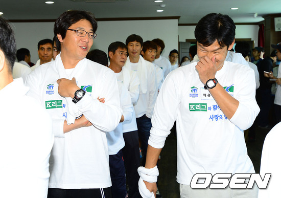 4일 오후 경기도 파주시 법원읍 법원리 해비타트 파주 현장에서 'K리그와 함께하는 사랑의 집 고치기' 봉사활동에서 포항 황선홍 감독과 서울 최용수 감독이 이야기를 나누고 있다