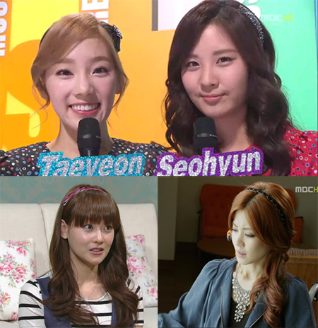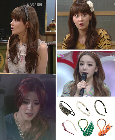소녀시대의 태연과 서현은 MBC음악방송프로그램 ‘쇼!음악중심’ 에서 꾸준히 헤어 액세서리를 착용한다. 세련된 블링블링한 주얼장식의 헤어밴드로 러블리한 이미지를 한층 더 사랑스럽고 빛나게 연출 했다. 카라의 구하라는 여성스러운 핑크와 골드 체인장식이 포인트인 헤어밴드로 한층 더 성숙미 있는 모습을 보였다.