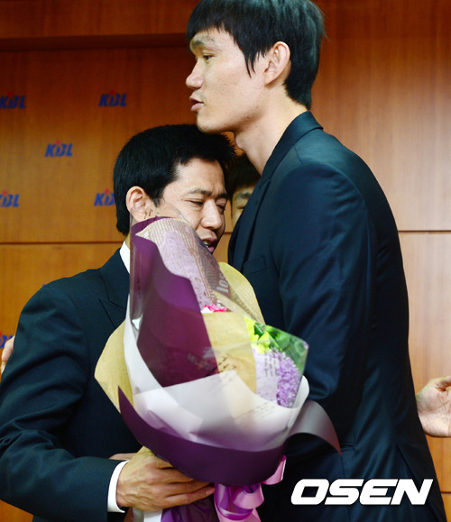 신기성이 동부 김주성과 포옹을 하고 있다.