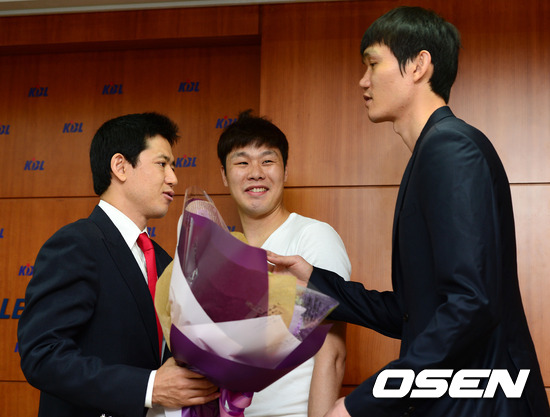 신기성이 조성민 김주성의 꽃다발을 건네받고 있다.