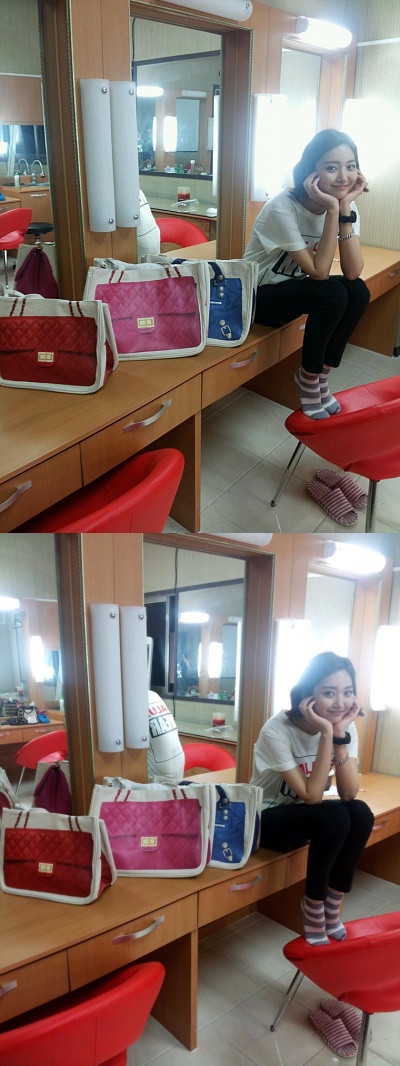 공개된 사진 속 고준희는 대기실 책상에 앉아 두손에 턱을 괴고 있다. 사진 속 고준희는 손바닥만한 작은 얼굴과 늘씬한 몸매를 과시했다. 특히 고준희의 옆에는 가방 모양이 그려진 에코백이 나란히 진열돼 있어 눈길을 끌었다.