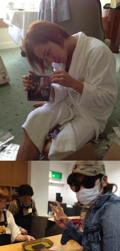 사진 속 장근석은 하얀 샤워 가운을 입고 호텔방 바닥에 앉아 자신의 정규앨범 CD 포장지를 개봉하고 있다.