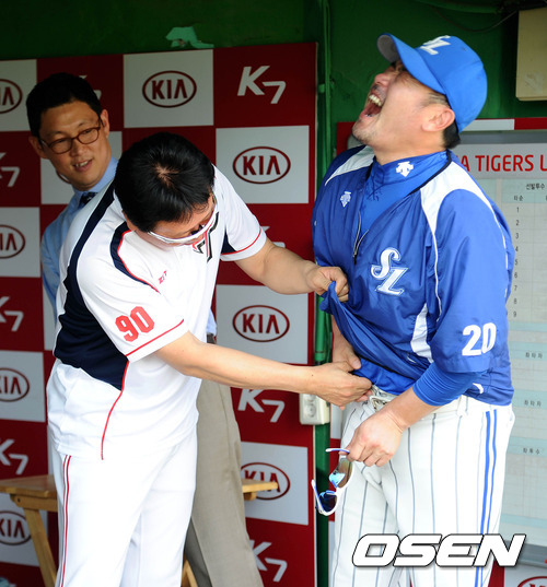 5일 오후 광주 무등야구장에서 열린 '2012 팔도 프로야구' KIA 타이거즈와 삼성 라이온즈의 경기에 앞서 KIA 선동렬 감독이 삼성 진갑용의 뱃살을 만져보고 있다.