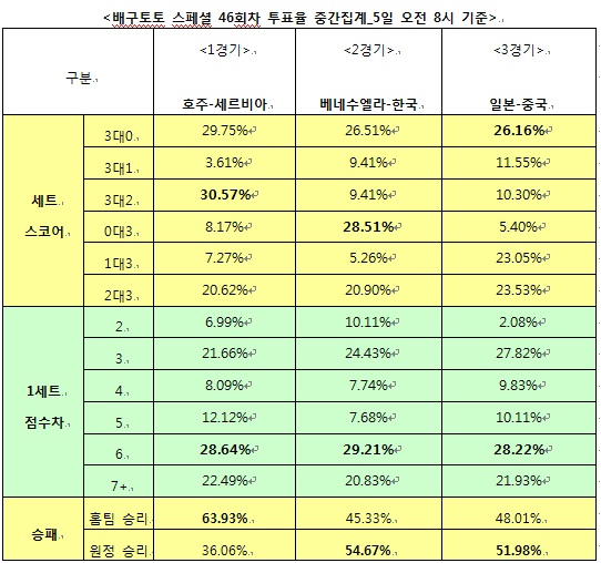 [배구토토] 국민체육진흥공단(www.kspo.or.kr)이 발행하는 체육진흥투표권 수탁사업자인 스포츠토토 공식 온라인 발매사이트 베트맨(www.betman.co.kr)이 오는 6일 열리는 2012 런던올림픽 남자배구 세계예선전 호주-세르비아(1경기)전, 베네수엘라-한국(2경기)전, 일본-중국(3경기)전 등 총3경기를 대상으로 한 배구토토 스페셜 46회차 게임 투표율 중간집계 결과 일본-중국(3경기)에서 참가자의 51.98%는 중국의 승리를 예상했다고 밝혔다.