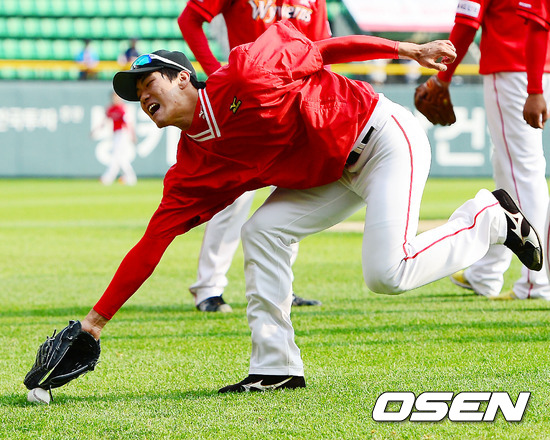 5일 오후 서울 잠실구장에서 '2012 팔도 프로야구' 두산 베어스와 SK 와이번스의 경기가 열릴 예정인 가운데 SK 김광현이 수비 훈련중 볼을 놓치고 있다.