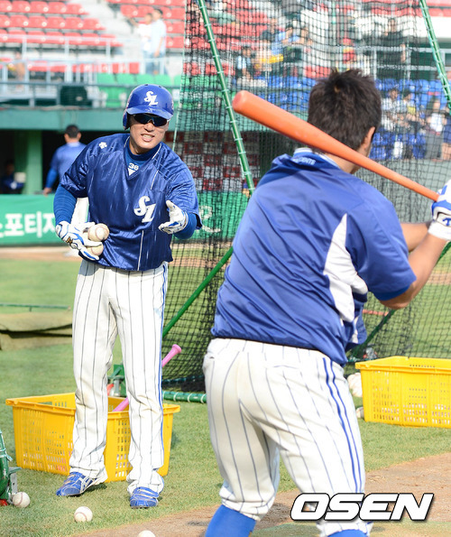 5일 오후 광주 무등야구장에서 열린 '2012 팔도 프로야구' KIA 타이거즈와 삼성 라이온즈의 경기에 앞서 삼성 이승엽이 박석민의 타격 훈련을 돕고 있다.