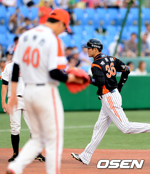 5일 오후 대전구장에서 열린 '2012 팔도 프로야구' 한화 이글스와 롯데 자이언츠의 경기, 2회초 무사에서 롯데 박종휸이 솔로포를 날리고 그라운드를 돌고있다.