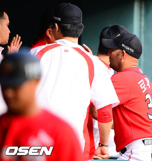 5일 오후 서울 잠실구장에서 열린 '2012 팔도 프로야구' 두산 베어스와 SK 와이번스의 경기에서 SK 선발 로페즈가 1회를 마치고 덕아웃에서 동료들과 하이파이브를 하고 있다.