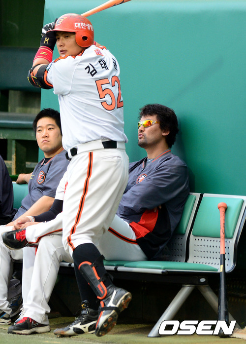5일 오후 대전구장에서 열린 '2012 팔도 프로야구' 한화 이글스와 롯데 자이언츠의 경기, 1회말 한화 김태균이 박찬호 앞에서 방망이를 휘두르며 타석을 준비하고 있다.