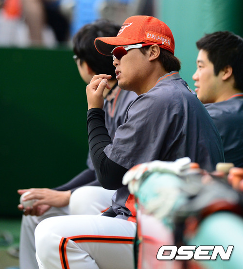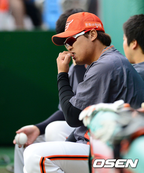 5일 오후 대전구장에서 열린 '2012 팔도 프로야구' 한화 이글스와 롯데 자이언츠의 경기, 1회초 한화 류현진이 손톱을 물어 뜯으며 경기를 지켜보고 있다.