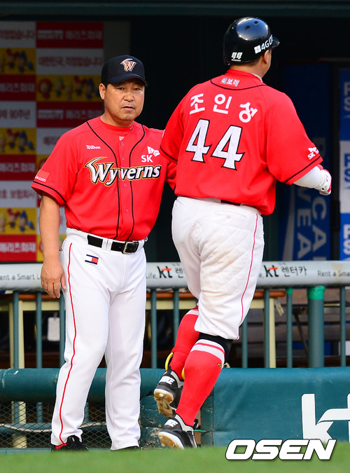 5일 오후 서울 잠실구장에서 열린 '2012 팔도 프로야구' 두산 베어스와 SK 와이번스의 경기에서 3회초 첫타석에서 SK 조인성이 좌월 솔로 홈런을 날린 후 덕아웃에서 이만수 감독과 하이파이브를 하고 있다.