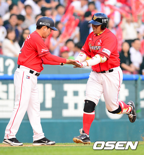 5일 오후 서울 잠실구장에서 열린 '2012 팔도 프로야구' 두산 베어스와 SK 와이번스의 경기에서 3회초 첫타석에서 SK 조인성이 좌월 솔로 홈런을 날린 후 3루에서 이광근 코치와 하이파이브를 하고 있다.