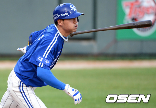 5일 오후 광주 무등야구장에서 열린 '2012 팔도 프로야구' KIA 타이거즈와 삼성 라이온즈의 경기, 2회초 1사 1,3루 삼성 김상수가 3루주자 강봉규를 불러 들이는 내야 땅볼을 치고 있다.