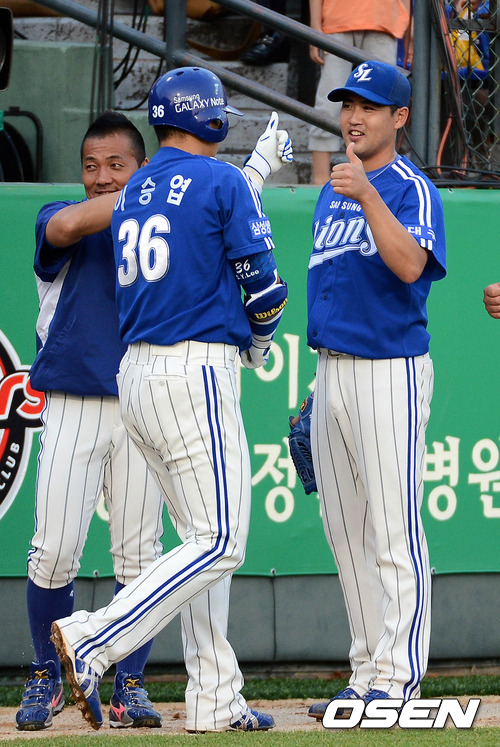 5일 오후 광주 무등야구장에서 열린 '2012 팔도 프로야구' KIA 타이거즈와 삼성 라이온즈의 경기, 3회초 1사 1루 삼성 이승엽이 우월 투런 홈런을 치고 더그아웃에서 선발 투수 장원삼의 축하를 받고 있다.