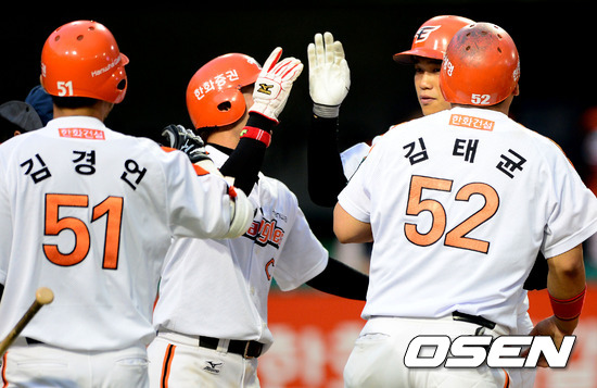 5일 오후 대전구장에서 열린 '2012 팔도 프로야구' 한화 이글스와 롯데 자이언츠의 경기, 3회말 2사1,3루에서 한화 최진행이 스리런 홈런을 날리고 홈을 밟으며 동료선수들의 축하를 받고 있다.