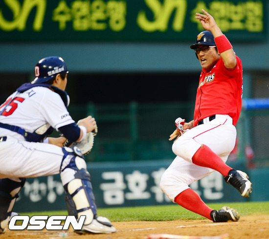 5일 오후 서울 잠실구장에서 열린 '2012 팔도 프로야구' 두산 베어스와 SK 와이번스의 경기에서 4회초 2사 주자 1,2루 SK 임훈의 좌익수 앞 1타점 적시타때 2루 주자 박정권이 홈으로 몸을 날리며 세이프되고 있다.
