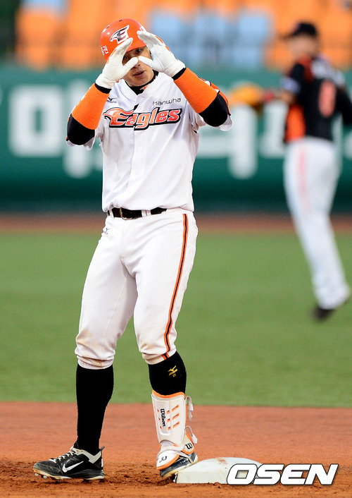 5일 오후 대전구장에서 열린 '2012 팔도 프로야구' 한화 이글스와 롯데 자이언츠의 경기, 3회말 1사2루에서 한화 정범모가 동점 적시 2루타를 날리고 타임을 외치고 있다.