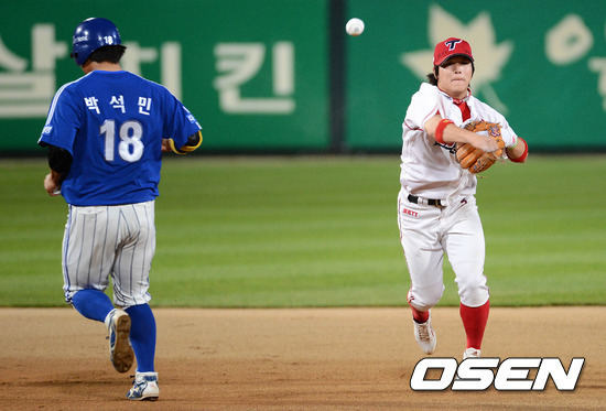 5일 오후 광주 무등야구장에서 열린 '2012 팔도 프로야구' KIA 타이거즈와 삼성 라이온즈의 경기, 6회말 무사 1루 삼성 강봉규의 병살타때 KIA 김선빈이 1루주자 박석민을 포스아웃 처리하고 1루로 송구하고 있다.