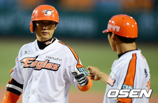 5일 오후 대전구장에서 열린 '2012 팔도 프로야구' 한화 이글스와 롯데 자이언츠의 경기, 4회말 1사1,2루에서 한화 강동우가 1타점 적시타를 날리고 최만호 코치와 주먹을 맞대고 있다.