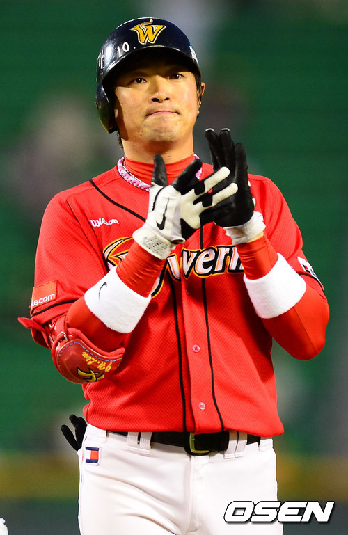 5일 오후 서울 잠실구장에서 열린 '2012 팔도 프로야구' 두산 베어스와 SK 와이번스의 경기에서 6회초 1사 주자 2,3루 SK 임훈이 우익수 왼쪽 2타점 적시타를 날린 후 1루에서 박수를 치고 있다.