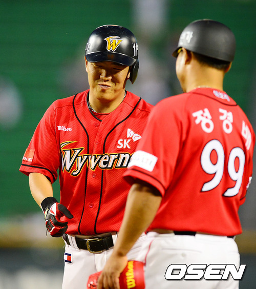 5일 오후 서울 잠실구장에서 열린 '2012 팔도 프로야구' 두산 베어스와 SK 와이번스의 경기에서 6회초 1사 주자 2루 SK 정근우가 우익수 앞 1타점 적시타를 날린 후 1루에서 정경배 코치와 하이파이브를 하고 있다.
