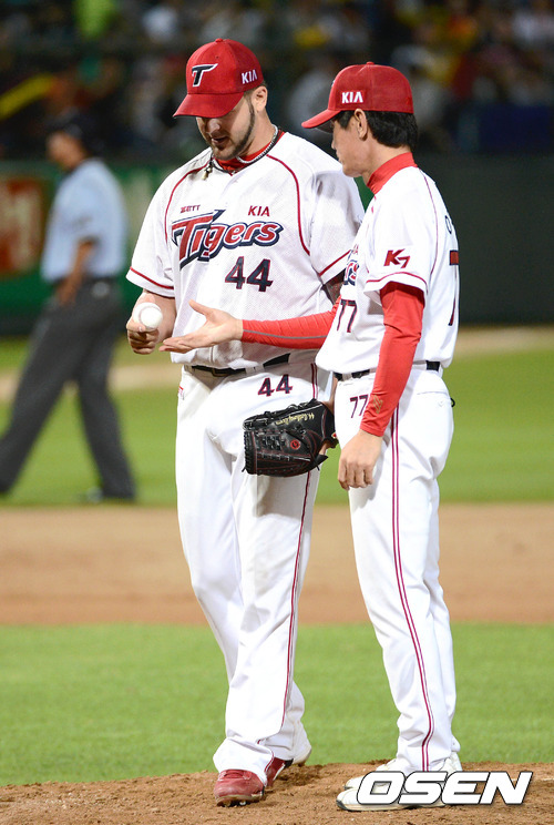 5일 오후 광주 무등야구장에서 열린 '2012 팔도 프로야구' KIA 타이거즈와 삼성 라이온즈의 경기, 7회초 1사 1,3루 삼성 박한이 타석때 KIA 앤서니가 마운드를 내려가고 있다. 앤서니는 6⅓이닝 3실점을 기록했다.