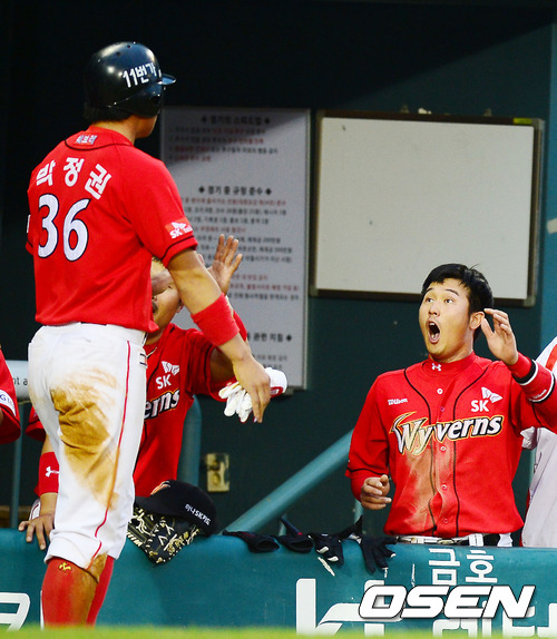 5일 오후 서울 잠실구장에서 열린 '2012 팔도 프로야구' 두산 베어스와 SK 와이번스의 경기에서 4회초 2사 주자 1,2루 SK 임훈의 좌익수 앞 1타점 적시타때 2루 주자 박정권이 홈으로 몸을 날리며 세이프된 후 덕아웃에서 최정과 기쁨을 나누고 있다.