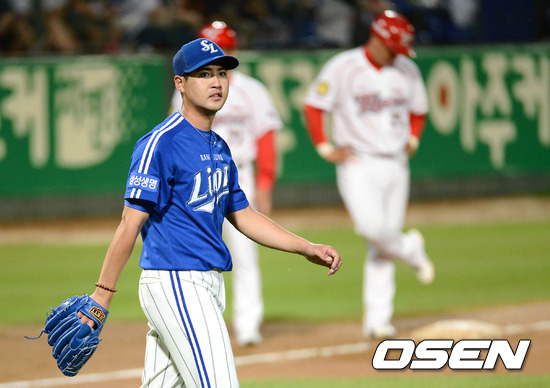 5일 오후 광주 무등야구장에서 열린 '2012 팔도 프로야구' KIA 타이거즈와 삼성 라이온즈의 경기, 7회말 1사 1루 삼성 장원삼이 KIA 나지완에게 우전 안타를 허용하고 마운드로 올라가고 있다.