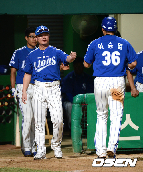5일 오후 광주 무등야구장에서 열린 '2012 팔도 프로야구' KIA 타이거즈와 삼성 라이온즈의 경기, 8회초 1사 2루 삼성 손주인의 우전 1타점 적시 2루타때 류중일 감독이 홈을 밟은 2루주자 이승엽과 하이파이브를 하고 있다.