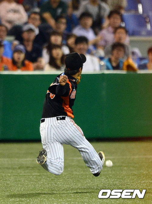 5일 오후 대전구장에서 열린 '2012 팔도 프로야구' 한화 이글스와 롯데 자이언츠의 경기, 6회말 1사1루에서 롯데 신본기가 한화 장성호의 타구를 놓치고 있다.