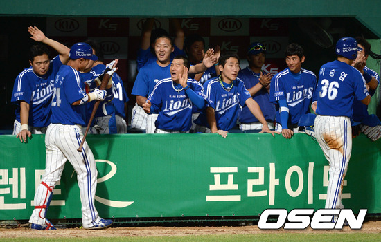 5일 오후 광주 무등야구장에서 열린 '2012 팔도 프로야구' KIA 타이거즈와 삼성 라이온즈의 경기, 8회초 1사 2루 삼성 손주인의 우전 1타점 적시 2루타때 홈을 밟은 2루주자 이승엽이 더그아웃에서 동료들의 축하를 받고 있다.