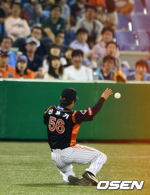 5일 오후 대전구장에서 열린 '2012 팔도 프로야구' 한화 이글스와 롯데 자이언츠의 경기, 6회말 1사1루에서 롯데 신본기가 한화 장성호의 타구를 놓치고 있다.