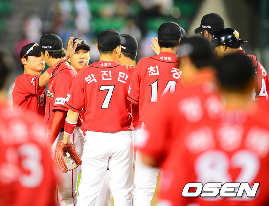경기를 마치며 SK 선수들이 마운드 근처에 모여서 하이파이브를 하고 있다. / rumi@osen.co.kr