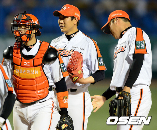 한화 최진행이 김혁민의 엉덩이를 토닥이며 승리를 축하해 주고 있다. /jpnews@osen.co.kr