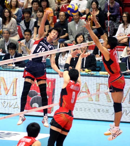 한일전이라는 긴장감 때문이었을까. 양 팀 모두 범실에 발목을 잡히며 한국은 1세트부터 상대의 끈질긴 수비에 페이스를 잃었다. 일본의 블로킹에 번번이 가로막힌 한국은 설상가상으로 상대팀 에이스 후쿠자와 다쓰야의 공격에 점수를 내주며 경기를 어렵게 풀어갔다.